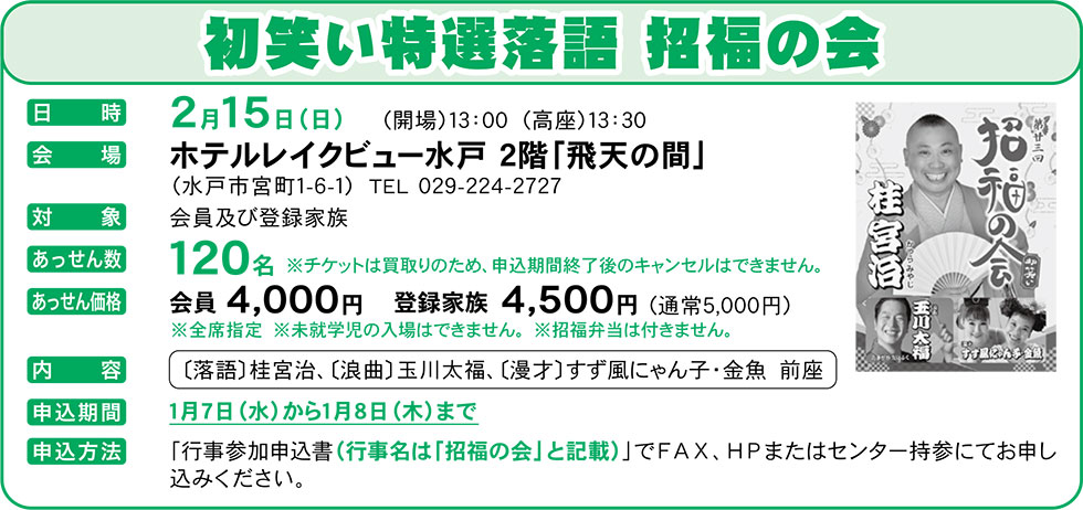 | 申し込み方法 | 行事名欄に希望コースを明記のうえ、「行事参加申込書(行事名は「歌舞伎ツアー○コース」と記載)」でFAX、HPまたはセンター持参にてお申し込みください。 |