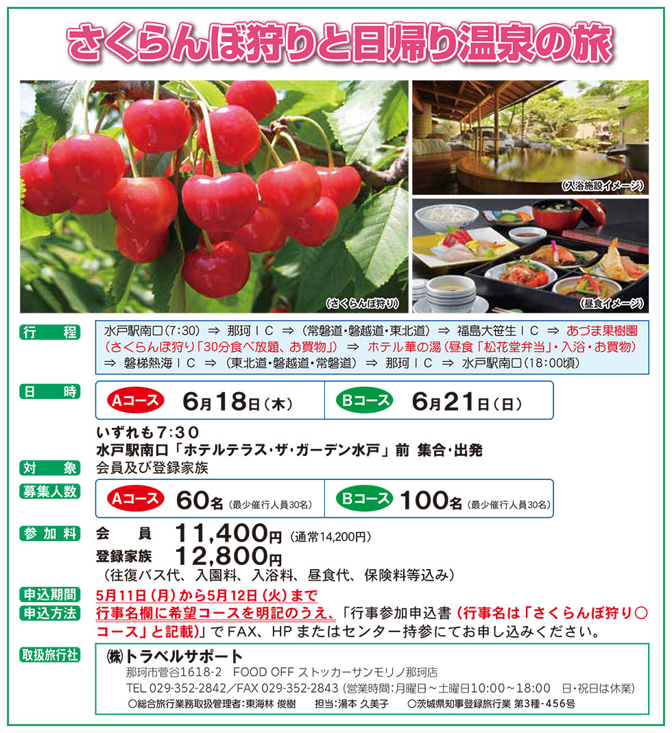 | 申し込み方法 | 行事名欄に希望コース名を明記のうえ、「行事参加申込書(行事名は「さくらんぼ狩り〇コース」と記載)」でFAX、HPまたはセンター持参にてお申し込みください。 |