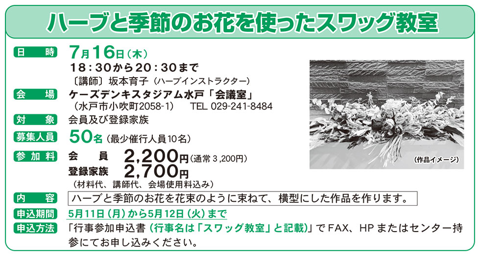 | 申し込み方法 | 「行事参加申込書(行事名は「スワッグ教室」と記載)」でFAX、HPまたはセンター持参にてお申し込みください。 |